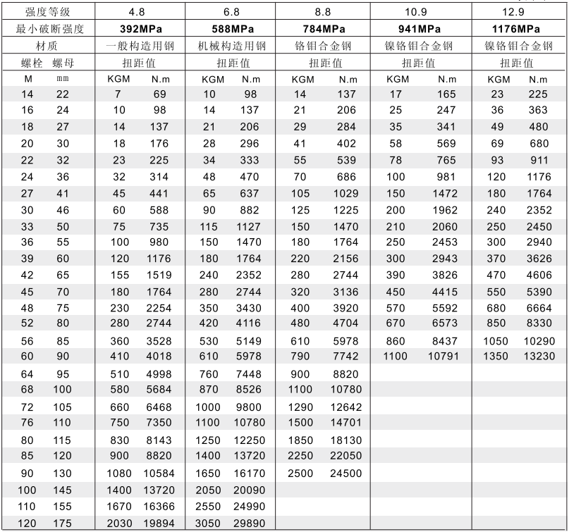 注:表中數值為德國工業標準,在螺栓達到屈服極限的80%時所