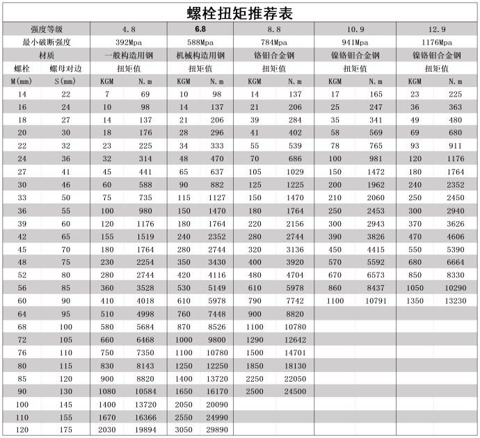 建議鎖緊扭矩力為:表中數值x90%例如:M52,8.8級螺栓,則鎖緊力矩為:4704x90%=4233.6N.m。