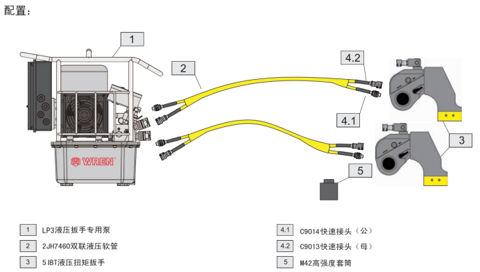若您對現場工藝要求的鎖緊扭矩值不明,WREN工程師會為您推薦使用。您也可以按以下步驟自己推算。從螺栓及螺母最大扭矩值推薦表中,按照螺栓尺寸、強度查表得出一個接近于真實的扭矩值。如本例中的M42(S65) 查表得螺栓鎖緊扭矩為2744x90%=2470N.m,因螺栓拆松力矩為鎖緊的1.5~2倍,選配液壓扳手時最大扭矩值應該大于4940N.m。查扭矩扳手選型表得最適宜扭矩扳手為5IBT型液壓扭矩扳手。